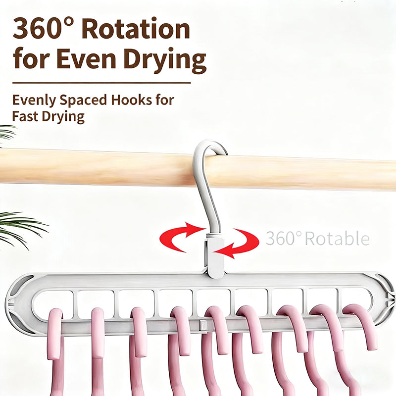 Crafted from durable PP material, the Smart QIAWI is built to last. Its 360° rotating hook allows you to hang clothes horizontally or vertically, making it versatile for organizing or air-drying. With nine slots, you can easily store shirts, jackets, pants, or even freshly washed clothes—all in one compact solution.